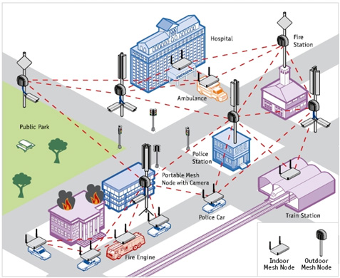 Firetide HotPoint access points can optionally be deployed indoors or outdoors to provide first responders and other public safety officials with commercial Wi-Fi communications. Because the mesh is a multipoint-to-multipoint network, and not point-to-point, FCC restrictions on permanent installations do not apply. This same characteristic also allows a HotPort mesh to overcome the many line-of-sight obstructions that cause problems with other wireless technologies.