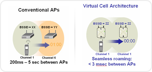 | 사용자는 로밍시에도 연결 할 수 있어야 한다. 오늘날의 AP 들은 제한된 기능들 때문에 이동시에는 서비스를 받을 수 없다. Virtual AP 기술과 함께, 멀티플 AP는 광범위 AP, 하나의 강력한 것과 같이 서브하기 위하여 허락한다는 지적인 답변을 전달한다. 멀티플 AP 기능은 사용자들이 서비스 끈김 없이 Roaming 을 허락하고 투명한 Roaming을 제공하기 위한 기능이다. 하나의 싱글 Virtual 셀은 self-healing 과 네트웍 인지에 대한 통합 RF 모니터링 및 실제 투명 Mobility 에 대한 물리적 AP들 사이의 zero-hand off 와 최적화된 Load-Balancing 을 제공한다. Meru는 독자적인 Virtual Cell Architecture를 구성하여 Zero Handoff를 지원한다. (일반 타회사는 Micro Cell Architecture라고 명칭한다.)