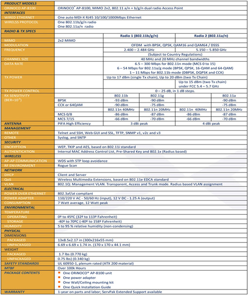 ORiNOCO® AP-8100은 기존의 훌륭한 성능을 공급하던 유선랜을 무선으로 바꾸려는 모든 규모의 기업에서 사용가능합니다. |